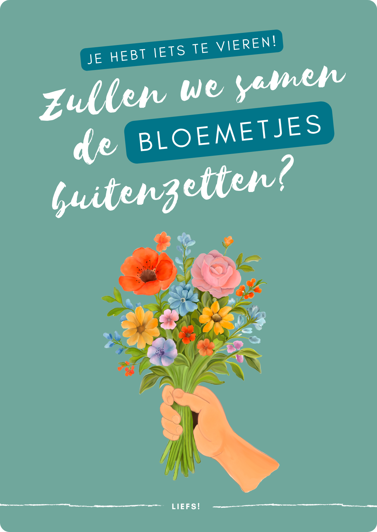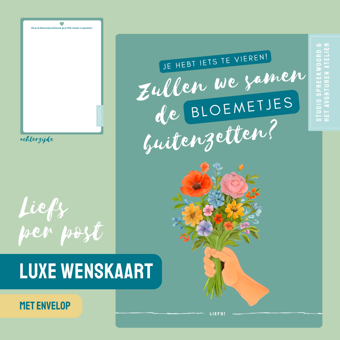 Wenskaart “Zullen we samen de bloemetjes buiten zetten?” – Felicitatiekaart met illustratie en envelop